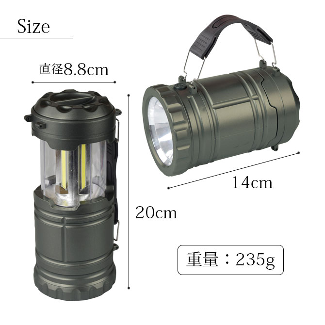 ランタンと懐中電灯が一つになったとっても便利なライトです。防災・レジャー・キャンプ・夜の散歩と色々使えて大活躍間違いなしです。